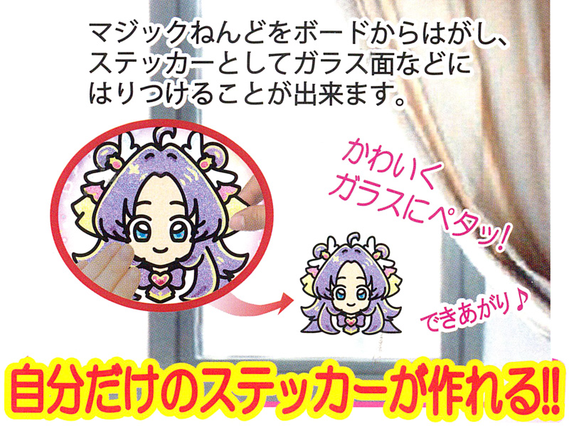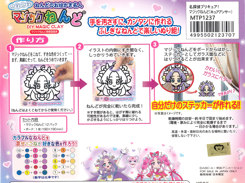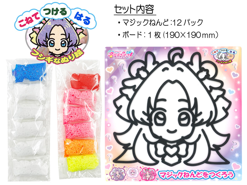様々な色の粘土をくっつけていくだけで塗り絵が完成する、ふわふわねんどの不思議なぬり絵キットに人気アニメ『名探偵プリキュア!』が仲間入り!作り方は、付属の6色のねんどをこねて、台紙のイラスト内側に、ぬり絵のようにすき間なく埋めていきます。※ねんどは混ざり具合で様々な色の表現が可能です。ねんどが乾くとはがす事ができ、ステッカーのようにガラス面にペタリと貼って楽しむこともできます。