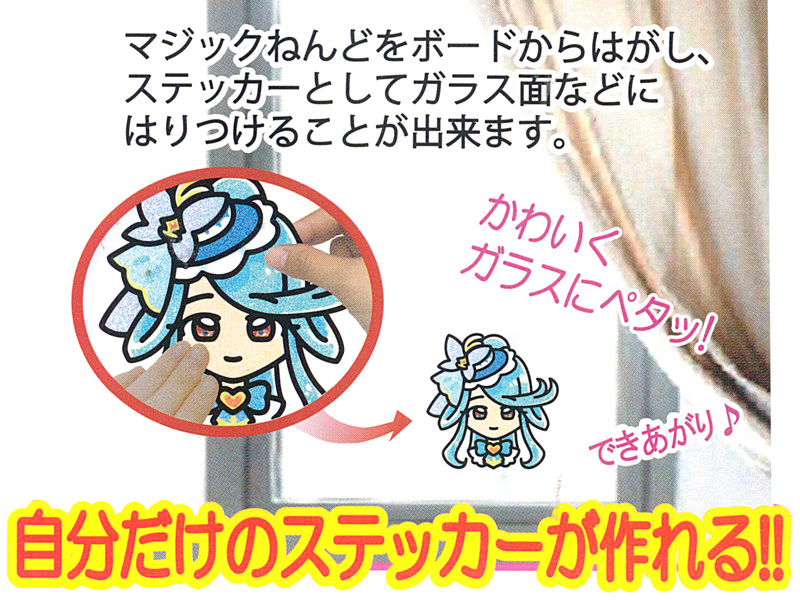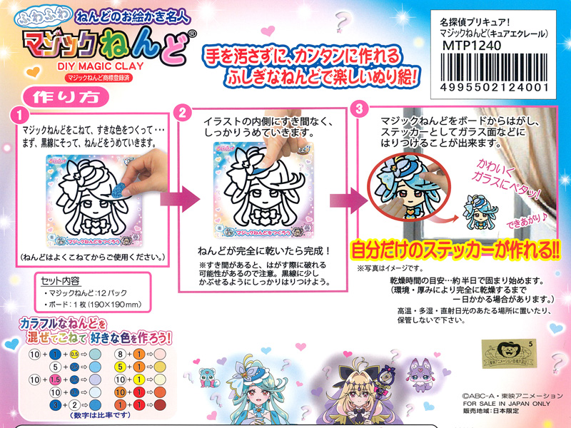 様々な色の粘土をくっつけていくだけで塗り絵が完成する、ふわふわねんどの不思議なぬり絵キットに人気アニメ『名探偵プリキュア!』が仲間入り!作り方は、付属の6色のねんどをこねて、台紙のイラスト内側に、ぬり絵のようにすき間なく埋めていきます。※ねんどは混ざり具合で様々な色の表現が可能です。ねんどが乾くとはがす事ができ、ステッカーのようにガラス面にペタリと貼って楽しむこともできます。