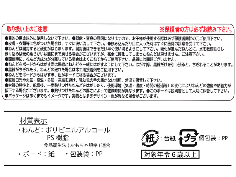 - 素材…(ねんど):ポリビニールアルコール/(ボード):紙/(包装袋):PP