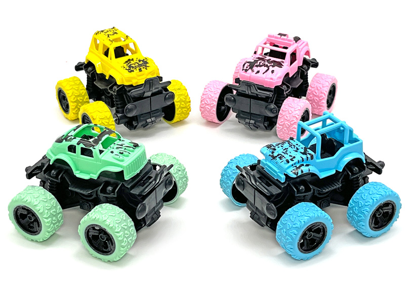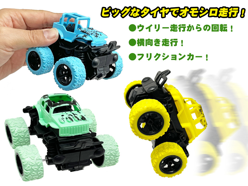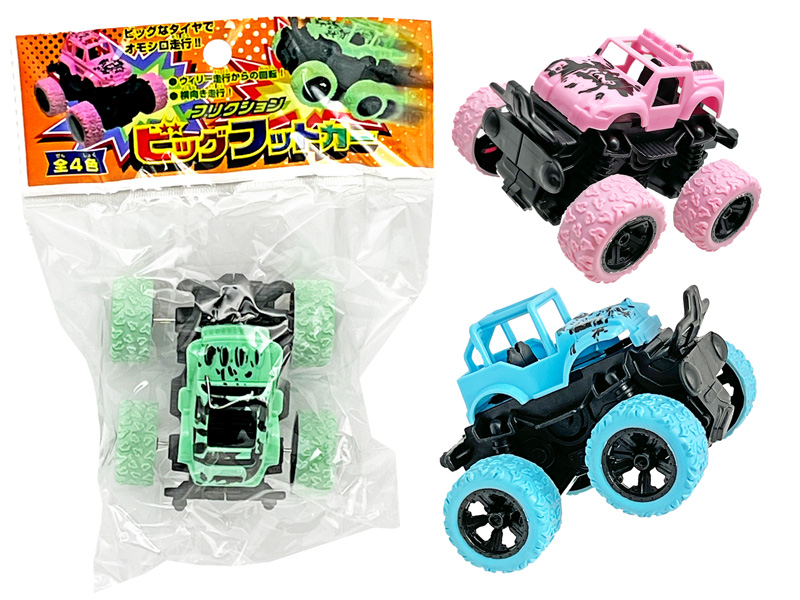 ビッグなタイヤでオモシロ走行!『フリクションビッグフットカー』が登場!走らせたい方向にタイヤを何度かこすりつけた後、手を離すと…ウイリーしながらくるくるスピン!横向きに走行します。ボディの色は全4色!玩具は個別包装されていますので、ランチセットの景品や各種イベントの販促・景品・プレゼントなどにもお渡ししやすいです。