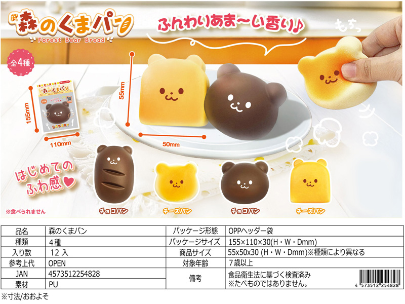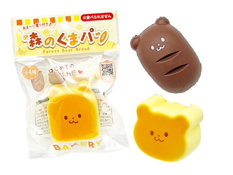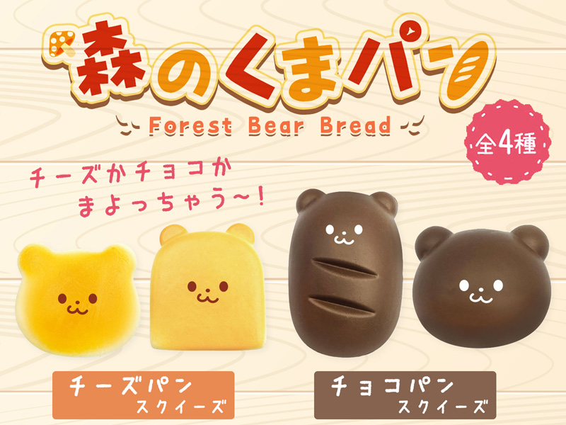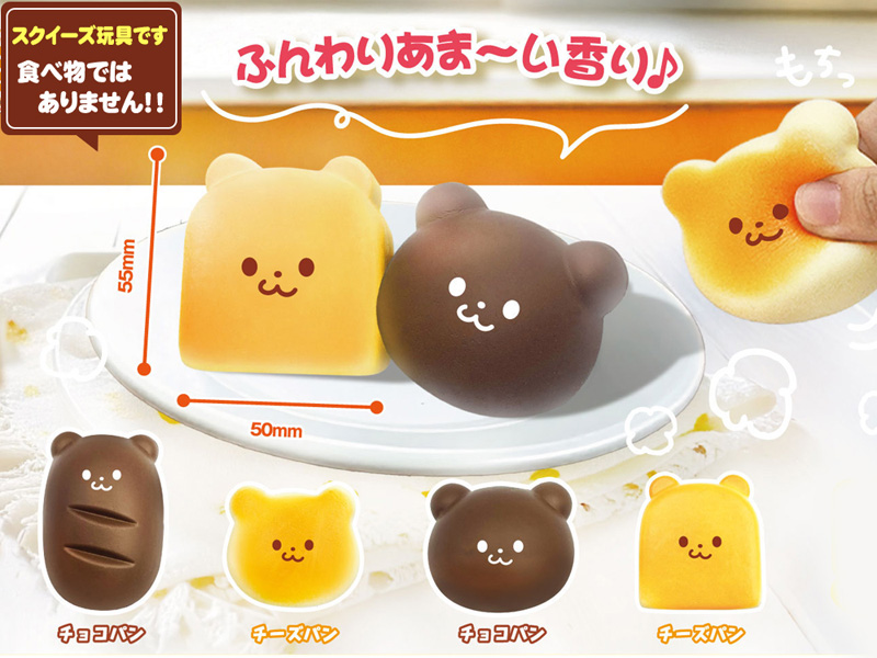 ふんわりあまぁ~い香り♪はじめてのふわ感♪とってもキュートな『森のくまパン』スクイーズが登場です。しっとりやわらかな感触のパンスクイーズは全4種類(チーズパン・チョコパン)どれもかわいくて迷っちゃう♪美味しそうな甘い香りもしますが食べちゃダメですよ~。女の子向けのプレゼント、景品玩具にゼヒ♪