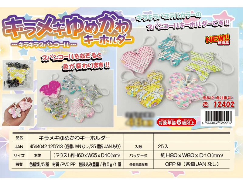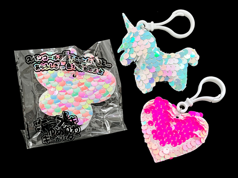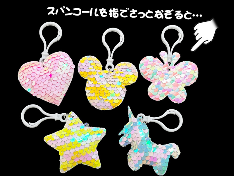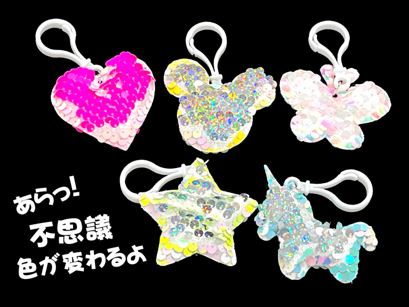 スパンコールを指でサっとなぞると…あら不思議?!色が変わるキラキラゆめかわキーホルダーが登場♪5種類のカタチがミックスされたミックスアソートパック。カラビナフック付きなのでカバンやリュックからぶら下げて持ち歩けます♪ガールズ向けの販促景品グッズにいかがでしょうか?