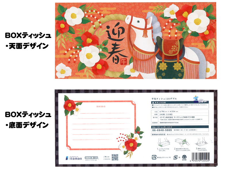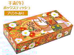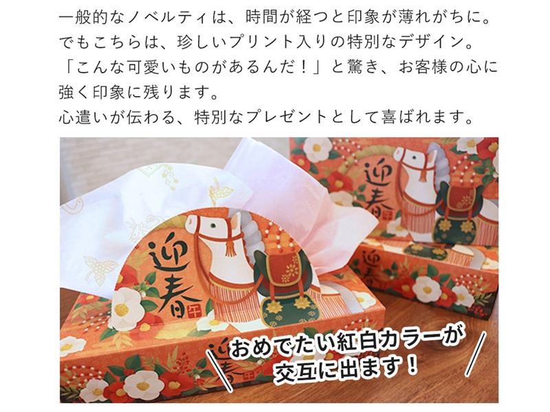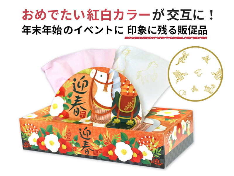 御歳暮や引越しの挨拶、イベント販促品におすすめ!午(うま)年デザインのボックスティッシュが登場!おめでたい紅白カラーのティッシュが交互にでてきます♪年末年始のイベントに印象に残るもらってうれしい販促品にうってつけですよ。