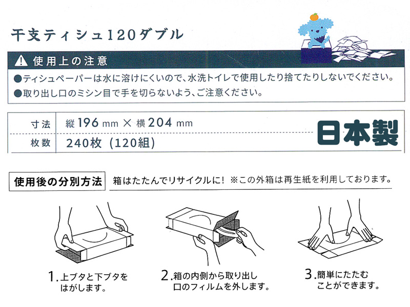 - ボックスティッシュ仕様…プリント生地(白地に山吹色の十二支柄プリント、ピンク無地(交互)
