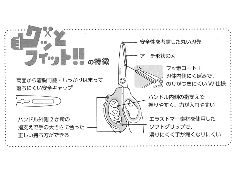 グッと握りやすくGOODなフィット感。『小学生文具 はさみ グッとフィット』が登場!非対称ハンドルになっており、手にフィットしやすい形状。ハンドル内側に指支えがあるので、握りやすく、力が入れやすい。ハンドル外側2ヶ所に指置きがあるので、人それぞれ異なる子供の手の大きさに合わせて、はさみの正しい持ち方ができる。ハンドルはソフトグリップなので、滑りにくく、手が痛くなりにくい。刃は少し厚みがあるので、紙以外にも牛乳パックやペットボトルなども切ることができ、図工や造形活動で使用できます。