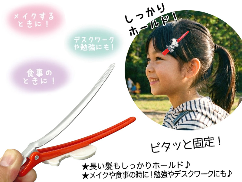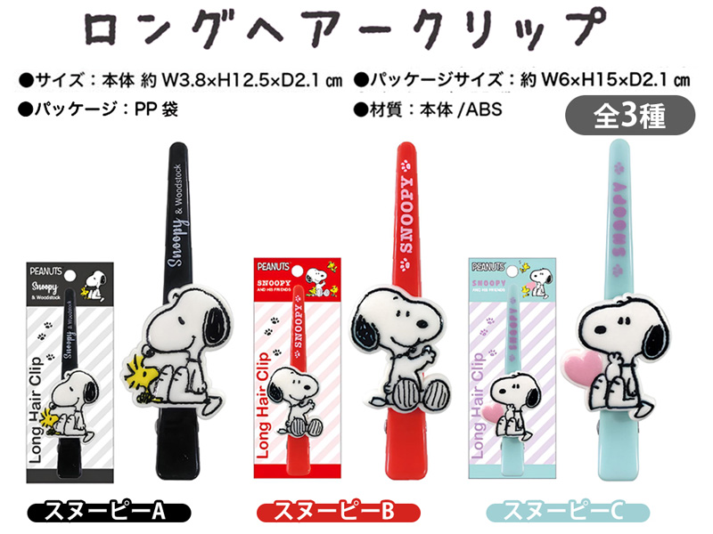 大きく開いてしっかりホールド!『スヌーピー』のロングヘアクリップ3種アソートです。全長約12.5㎝のロングなクリップが長い髪もしっかり固定!メイクや洗顔・食事・勉強やデスクワークなど、クセがつきにくいクリップで横髪をとめちゃいましょう。女の子向けのプレゼント景品に大変オススメです♪