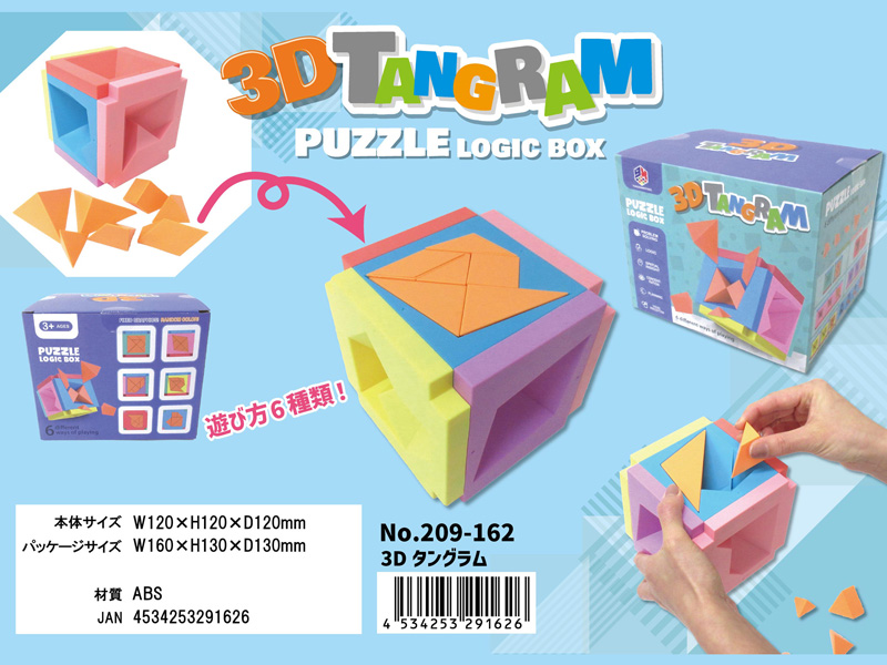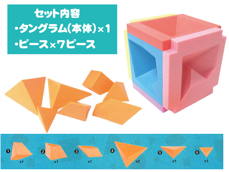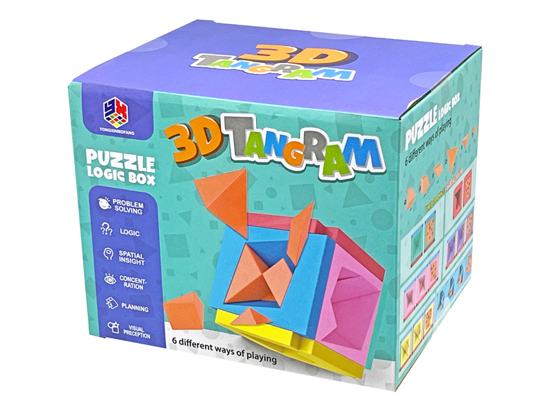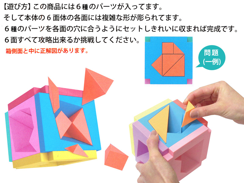 立体ブロックをはめ込むパズル『3Dタングラム』が登場!〈遊び方〉6種のカタチのパーツが入っています。そして本体の6面体の各面には複雑な形が彫られています。6種のパーツを各面ぼ穴に合うようにセットしきれいに収まれば完成です。6面すべて攻略できるか挑戦してみよう!箱の側面に解き方の正解も載っているので安心して遊べます。