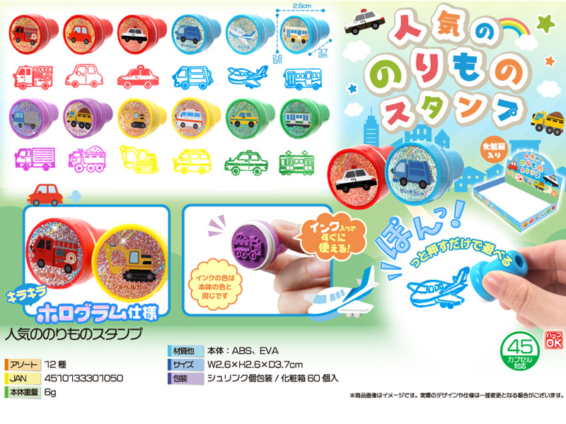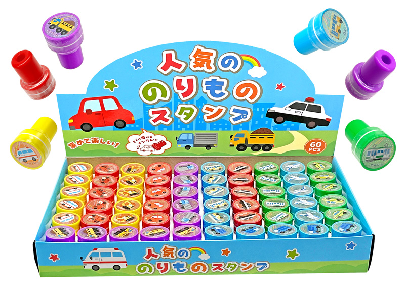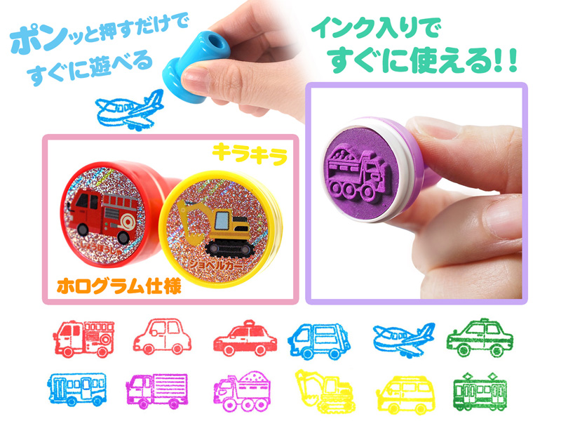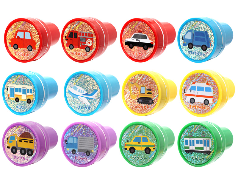 はたらく乗り物大集合~!「のりもの」デザインの丸型ミニスタンプが登場♪スタンプ本体はすでにインクが染みこんでいますので、そのまま紙にポンポン押して遊べます!パトカーや消防車に電車など…スタンプの柄はドドーンと全12種類!※スタンプの入っている化粧箱は、ディスプレイBOXとしてもご使用できます。