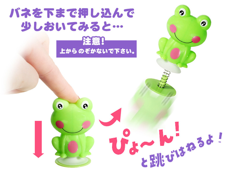 全長約7.5㎝「カエルさん」のジャンピングマスコットが登場~♪遊び方は、まず人形を平らな場所に置き、バネを下まで押し込み、そのまましばらく放置すると…とつぜん人形がピョーンと真上にはね上がります。ジャンプするタイミングは予測不能!?各種イベントの景品玩具にゼヒ! 【※注意!絶対に上からのぞきこまないでください】