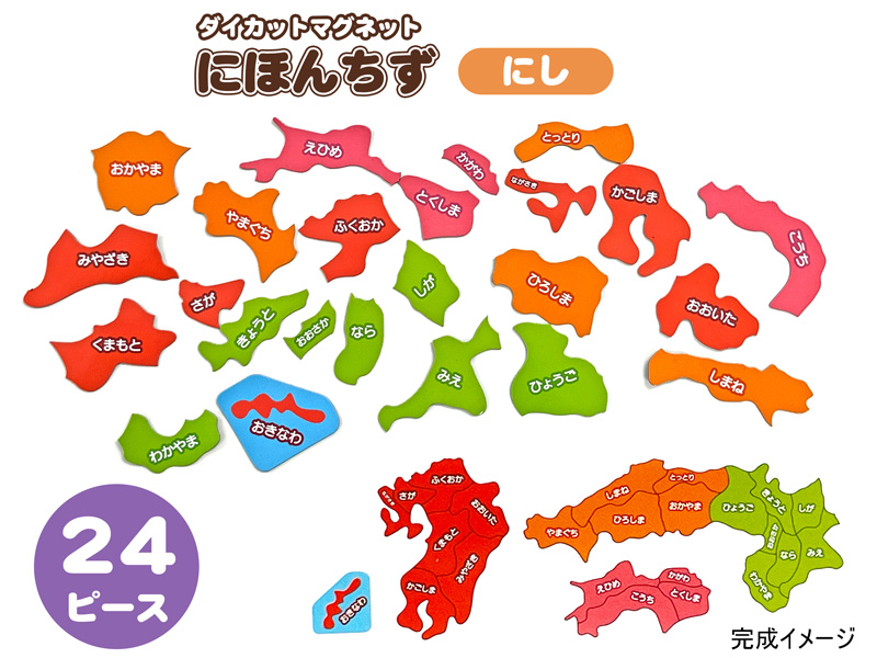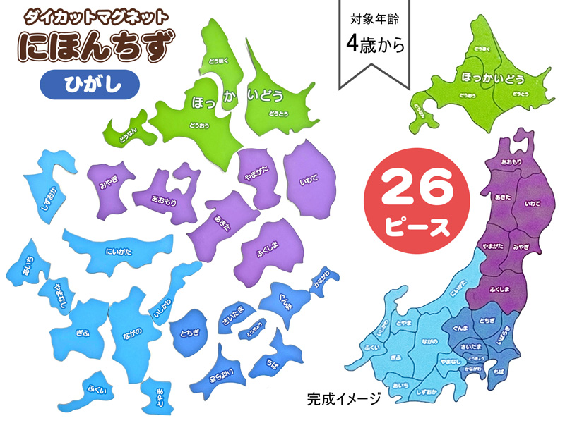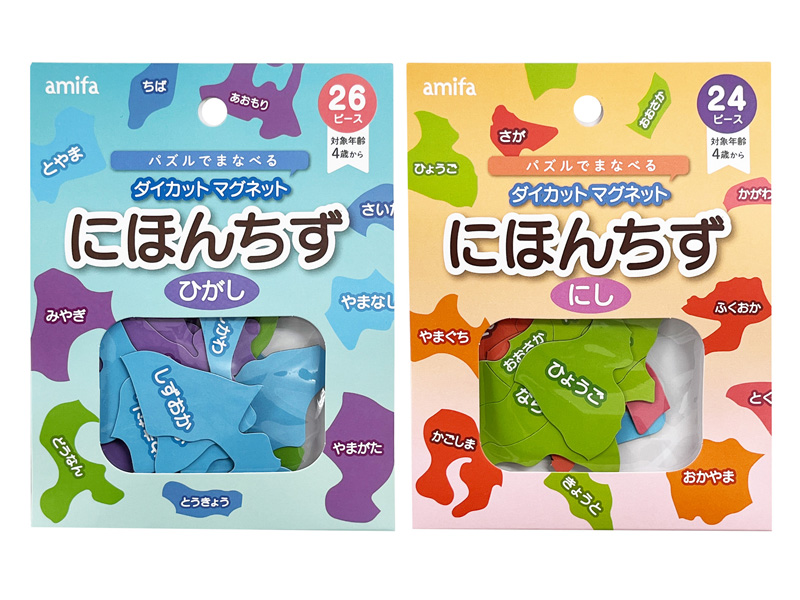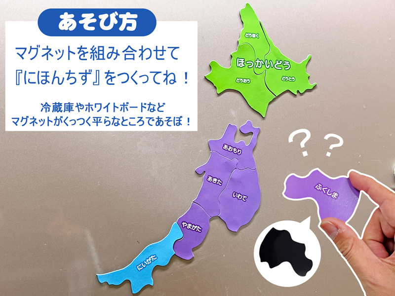 パズルでまなべる知育玩具『ダイカットマグネット・にほんちず』が登場!こちらは…日本地図の形のマグネットパズル。ピースをつなぎわせて日本地図をつくってみましょう。マグネットタイプなので、ホワイトボードや冷蔵庫などで繰り返し遊ぶことができます。(西日本・東日本)の2タイプがあります。