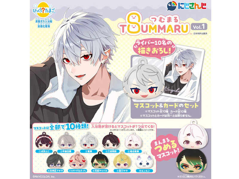 マスコット同士を「つめる」仕様が可愛い!顔型のマスコット「つむまる」シリーズにVTuber『にじさんじ』のキャラが登場~♪遊び方はマスコットのフック穴を、もう1つのマスコットの底面の穴にさしこむことでマスコットを積むことができ、フック穴にボールチェーンを通すと持ち運びも可能になります。さらに本商品では、各ライバーのお風呂上りの撮りおろしビジュアルを使用したカードも付属!…※1弾には10名のライバーがラインナップされています。