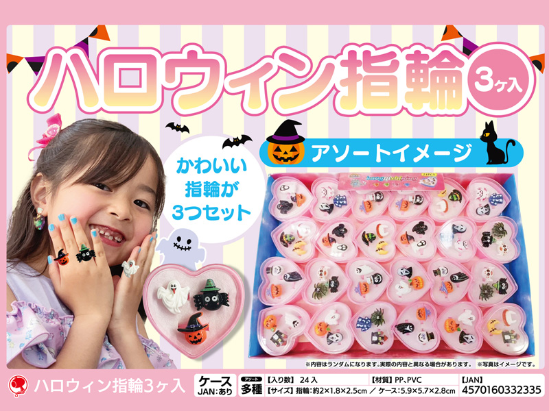キュートなハート型のケースに入ったハロウィン指輪(3個入)が登場~♪パンプキンやウィッチハット、スイパダー、ゴースト等々…ハロウィンをモチーフにした、ちょっぴり不気味でかわいらしいデザインの指輪がい~っぱい!ハロウィンシーズンの販促・景品玩具にゼヒ!