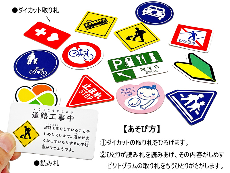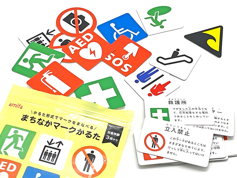 かるた形式でマークをまなべる知育玩具『まちなかマークかるた』が登場♪遊び方は…まずダイカットの取り札を机に広げます。ひとりが読み札を読み上げその内容が示す。ピクトグラムの取札を探して遊びましょう。