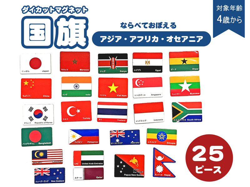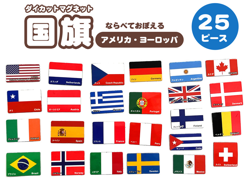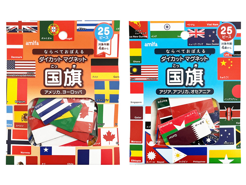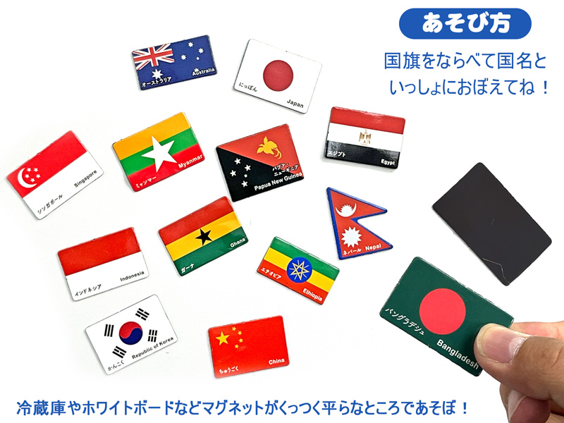 ならべておぼえる知育玩具『ダイカットマグネット・国旗』が登場!こちらは…世界の国旗と国名が覚えられる知育タイプのマグネットです。マグネットタイプなので、ホワイトボードや冷蔵庫などで繰り返し遊ぶことができます。マグネットは2タイプあります。