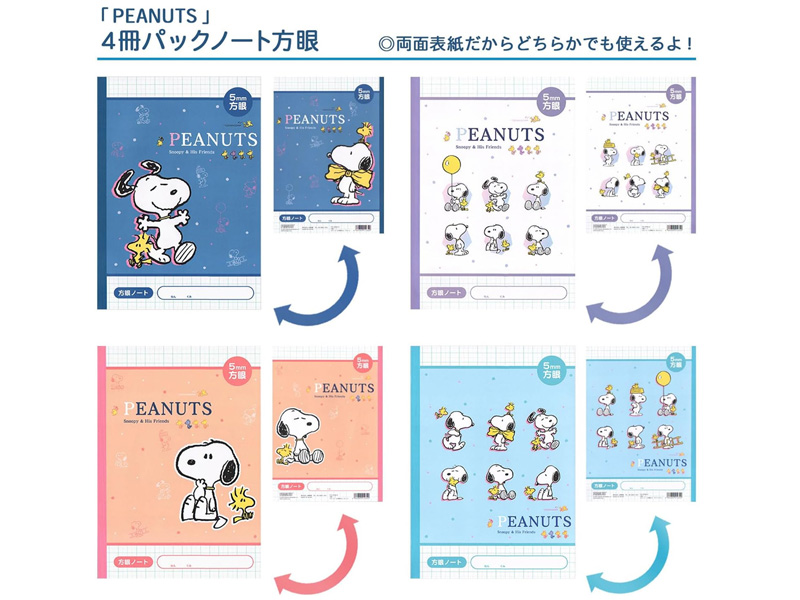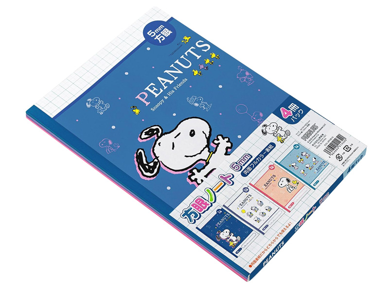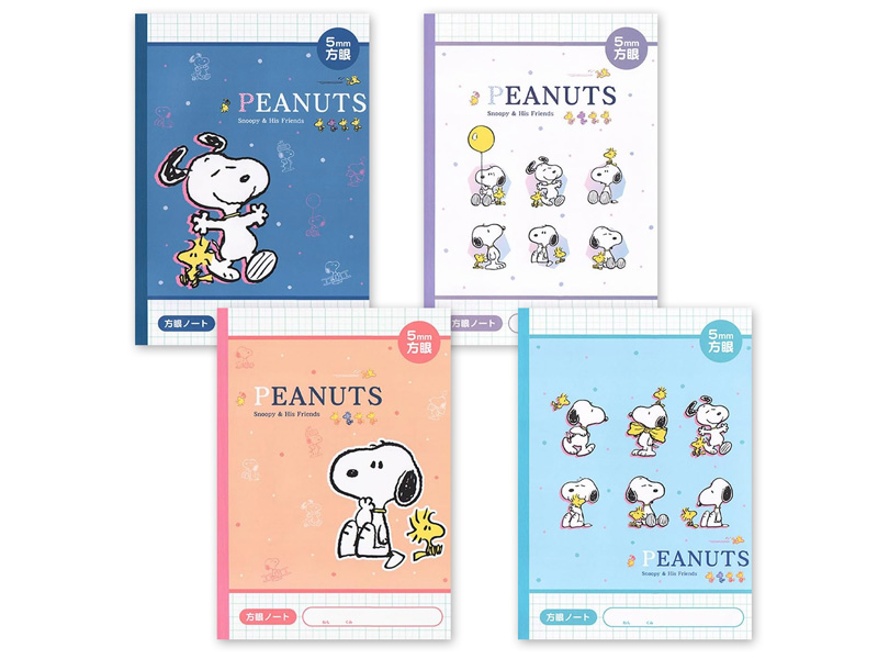 キュートなスヌーピーの5mm方眼ノート4冊パックが登場♪4冊すべて異なる表紙デザイン。両面表紙だからどちらからでも使えます。進級・新入学のプレゼントや各種イベントや大会などのノベルティ・景品・参加賞などにもオススメです。