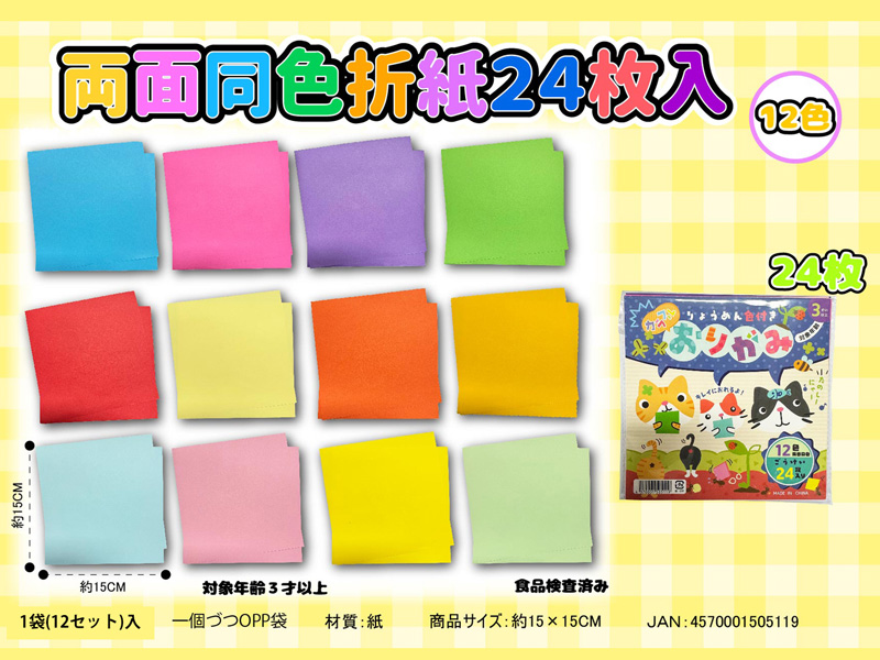 りょうめん色付きのカラフル折り紙24枚入が登場~♪両面色付きなのできれいに折れます!本体カラーは全12色。お子様へのプレゼント・景品にいかがでしょうか?