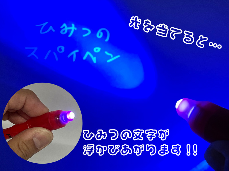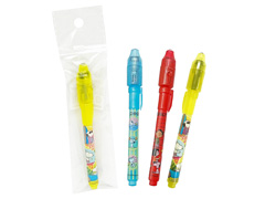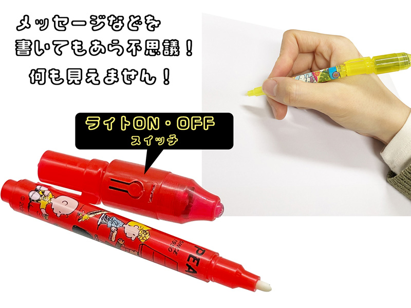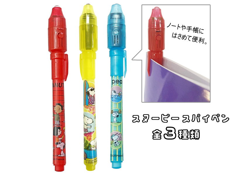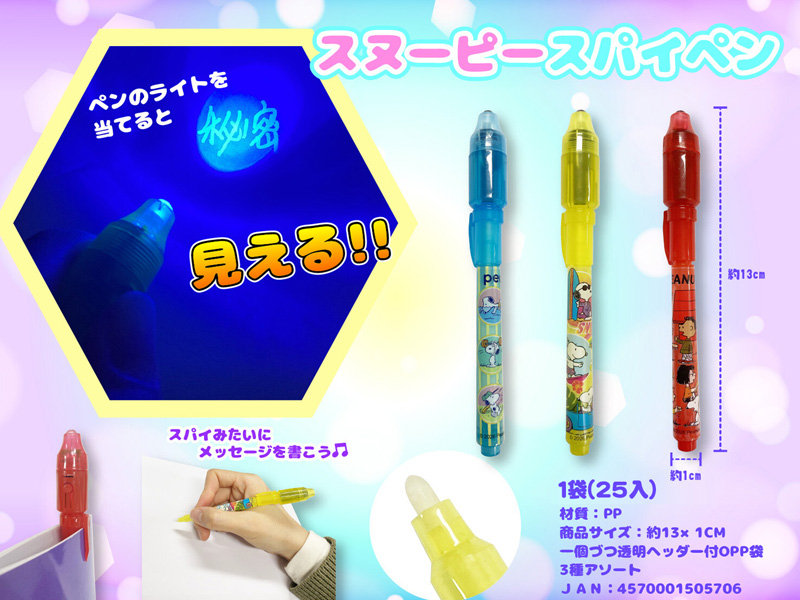 不思議なペンで秘密の情報交換♪「スヌーピー」のシークレットスパイペンが登場♪♪ノートや紙にペンで文字を書いてもアラ不思議っ!!何も見えません??ペンライトの特殊な光を当てると秘密の文字が浮かびあがります。ペン軸の柄は全部で3種類。友達同士のメッセージを伝える時に使いましょう☆子ども用文具景品に大変おススメです。