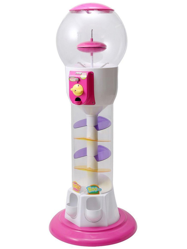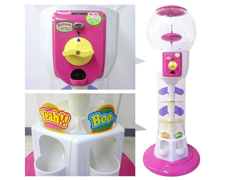 『専用メダル』で回る床上設置タイプのガチャガチャです。かわいいピンク色のボディとくるくる回りながら落ちてくるカプセルがお子様の好奇心を惹きつけます! メダルは別売りの【330006】をご購入ください。