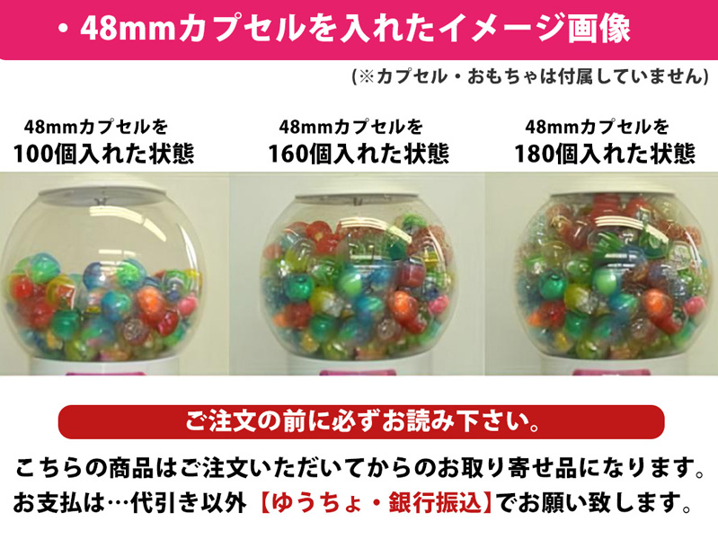 - 【ガチャマシンの仕様】・重さ /約8kg・メダル箱容量 / 約200枚・カプセル容量 / 48mmカプセルの場合…約180個(適量:140~150個)