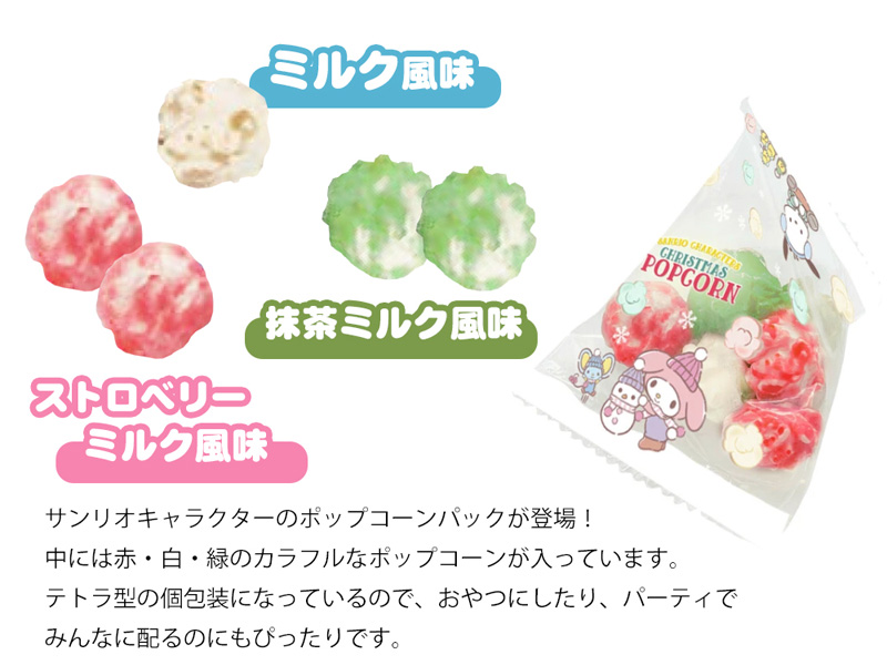 サンリオキャラクターのクリスマスポップコーンバッグが新登場!中には赤・白・緑のカラフルなポップコーンが入っています。テトラ型の個包装になっているので、おやつにしたり、パーティでみんなに配るのにもぴったりです♪
