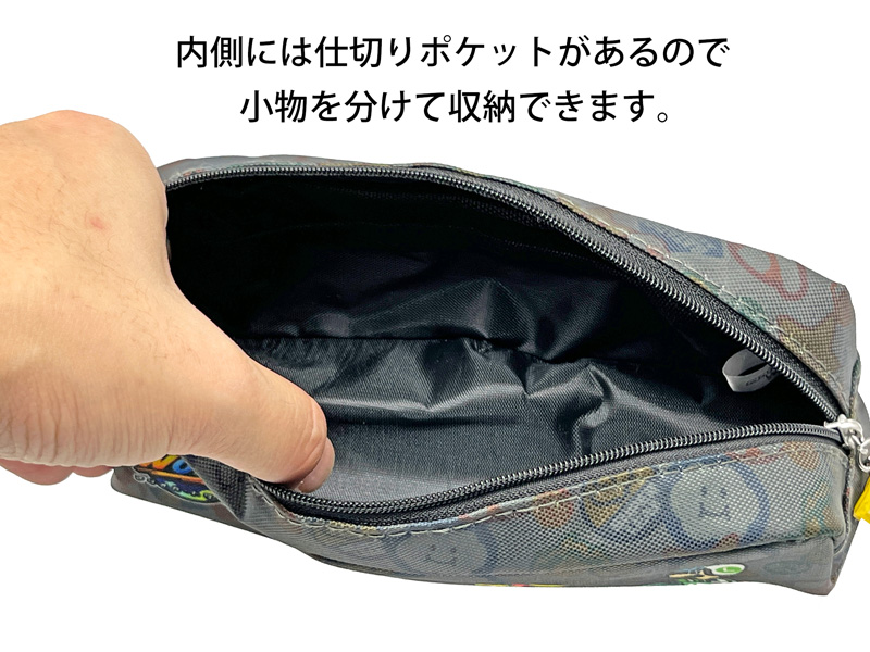 大人気ゲーム「マリオカートワールド」のマルチポーチが登場!ファスナーチャームもインパクト大でカッコイイ!内側に仕切りポケット付きで、細かな文具を整頓しやすい!横長の形状なので、ペンポーチに使うのが一番良さそうです。