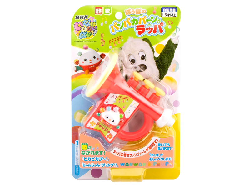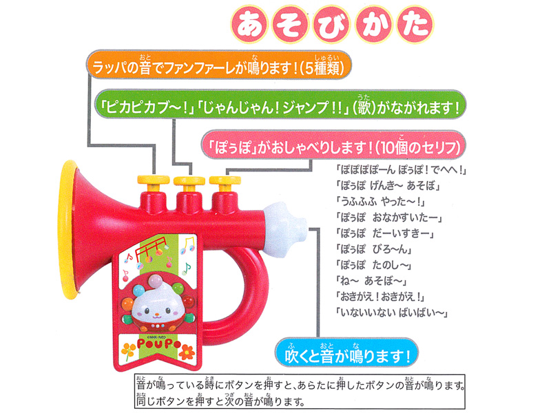 Eテレの子供番組「いないいないばぁっ!」よりぽぅぽのパンパカパーンラッパが登場~♪こちらは機能満載のラッパのおもちゃです。ボタンを押すとラッパの音でファンファーレや番組の歌「ピカピカブ~!」「じゃんじゃん!ジャンプ!!」を演奏します。「ぽぅぽ」のおしゃべり10種類が鳴ります。また実際に吹いても音が鳴ります。