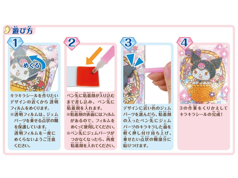 キラキラのアートシールづくりが楽しめる!サンリオキャラの「キラキラジェムシールキット」が登場~♪ 色付きの透明ジェムパーツを、キャラクターが描かれたシールシートに貼っていくことで、“キラキラシール”が完成します。 光の角度によって輝きが変わるジェムが、キャラクターの世界観をさらに引き立て、遊びながらデコレーションの楽しさも味わえるアイテムです。