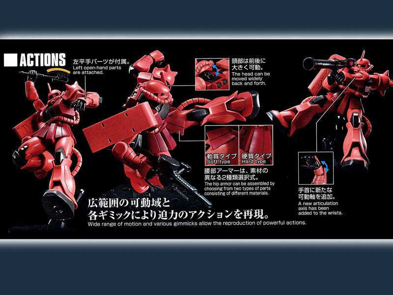 ガンプラ40周年記念!『機動戦士ガンダム』より、シャア専用ザクIIが新規造形にてHGシリーズに登場!!■『機動戦士ガンダム』におけるプロポーションを最新の技術でリバイブ。■モノアイは頭部裏側の操作リブを動かすことで可動。■腕は上腕部に加え前腕部も回転し、可動域を大きく確保。■腰部の可動域をさらに広げる軟質素材パーツを同梱。プラパーツと軟質素材パーツとの選択式となっている。■付属する3種の武器は、腰部に懸架できます!