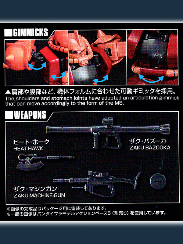- セット内容… ( シャア専用ザクII)×1体/【付属品】■PS成形スカートパーツ×1式、■ザク・マシンガン×1、■ザク・バズーカ×1、■ヒート・ホーク×1、■ホイルシール×1、