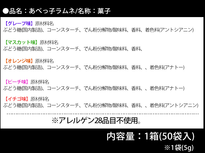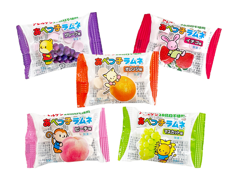 - フルーツラムネ:全5種類(マスカット・イチゴ・ピーチ・オレンジ・グレープ)…無果汁、/アレルゲン28品目不使用。