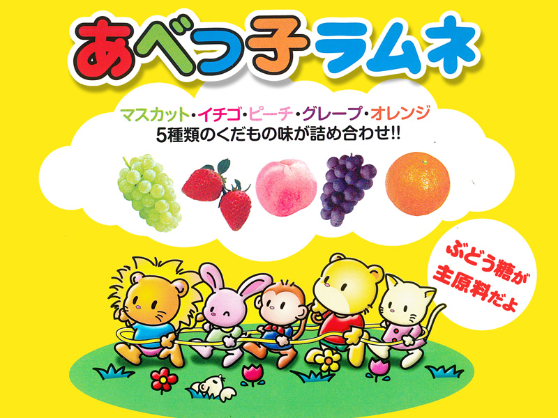 安部製菓のヒット商品「あべっ子フルーツラムネ」が登場!あべっ子ラムネとは…脳の唯一の栄養素であるブドウ糖を主原料にした口どけの良いラムネです。お子様のおやつにも、疲れた頭にも効果的!小さいお子さんからお年寄りまで、多くの人に味わっていただけますよ。