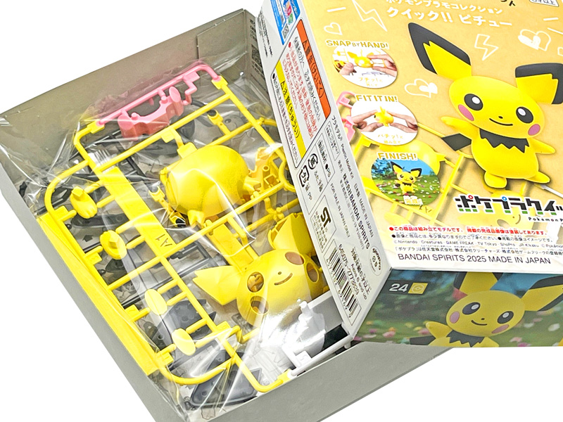 道具いらずの簡単組み立て!初めてでも簡単に組み立てられる「ポケプラクイック!!」に『ピチュー』が仲間入り!■全高約95mm。集めたくなる魅力的な可愛いポーズを楽しもう。■こだわりのパーツ分割で簡単組み立て&カラフルな仕上がりを両立。■特徴的なつやのある頭の毛を成形品で再現。■ランナーを見た瞬間、出来上がりが思い浮かぶシンプル仕様。■道具を使わないタッチゲート方式です。