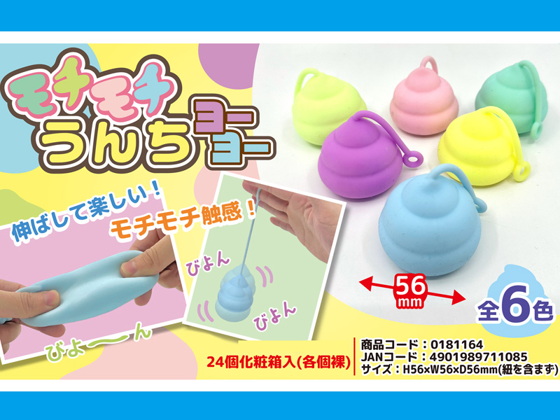 握って伸ばして楽しい!さわった感触を楽しむスクイーズ玩具より「モチモチうんちヨーヨー」が登場~♪こちらは、モチモチの触り心地がクセになるパステルカラーのうんち型スクイーズ。先端の穴に指を通せばヨーヨーみたいにポンポン跳ねて遊ぶこともできちゃいます♪