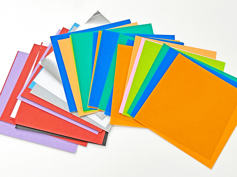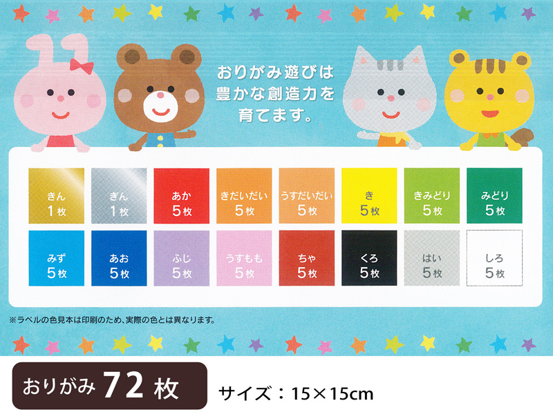 15㎝の角おりがみです。内容量は72枚/収録されている色紙(いろがみ)は全16色(金・銀各1枚入)!おりがみ遊びや、切り絵や貼り絵、指先のトレーニングなどなど用途は様々です!