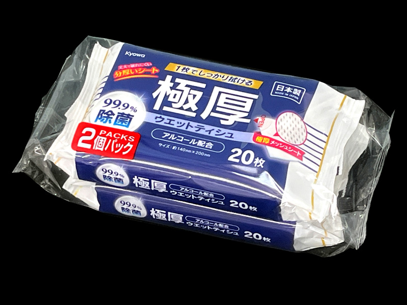 丈夫で破れにくい分厚いシート!除菌アルコールウェットティッシュ2Pセットが登場。通常より厚めのメッシュシートを使用したアルコールウエットティッシュなので1枚でしっかり拭き取れる!手や指の汚れ落としや、身のまわりの拭きとり掃除等に最適です。※全ての菌を除去するものではございません