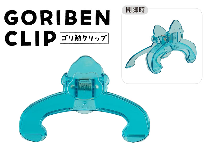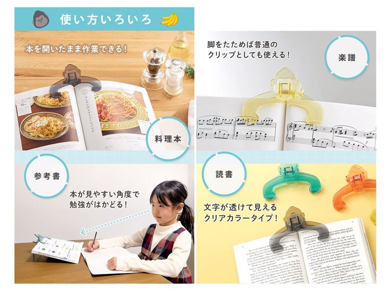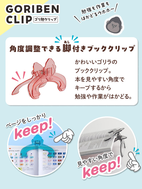 勉強の作業もはかどるウホウホ~♪かわいいゴリラのブッククリップが登場~!・角度調整できる脚付きなので、本を見やすい角度でキープ!脚をたためば普通のクリップとしても使えます。・ページをしっかり固定するので本を開いたまま作業ができます。 ・軽い力で開閉でき、お子さまやご高齢の方など、手の力が弱い方にも使いやすい設計です。 ・文字が透けて見えるクリアカラータイプ。クリップでとじた部分も文字が隠れません。