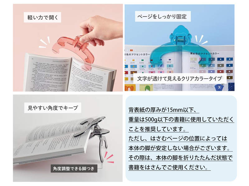 - ※本体の脚を開いて角度調整する場合、背表紙の厚みが15mm以下、重量は500g以下の書籍に使用していただくことを推奨します。ただし、はさむページの位置によっては本体の脚が安定しない場合がございます。その際は、本体の脚を折りたたんだ状態で書籍をはさんでご使用ください。