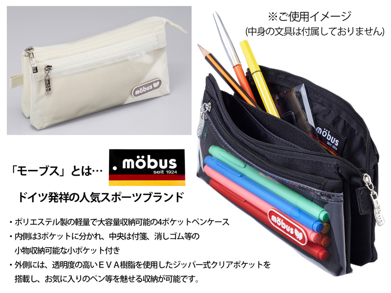 ドイツ発祥の人気スポーツブランド「モーブス」のペンケースが登場!こちらはポリエステル製の軽量で大容量収納可能の4ポケットペンケース。内側は3ポケットに分かれ、中央は付箋、消しゴム等の小物収納可能な小ポケット付き!・外側には、透明度の高いEVA樹脂を使用したジッパー式クリアポケットを搭載し、お気に入りのペン等を魅せる収納が可能です!