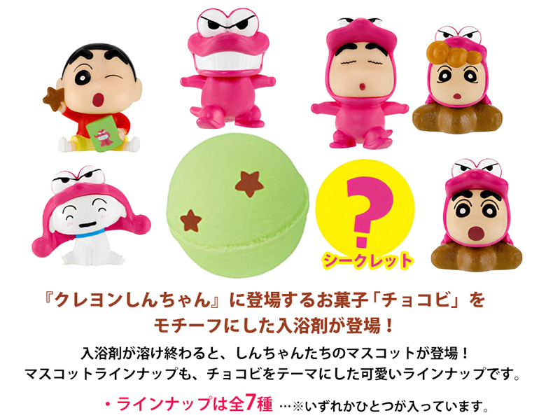 アニメ『クレヨンしんちゃん』の劇中に登場するお菓子「チョコビ」をモチーフにした入浴剤が登場だゾ~♪「チョコビ」の星形のチョコスナック菓子をイメージした星型のバスペタルが入った入浴剤をお湯に入れると、黄緑色の湯面に星型のバスペタルが散っていきます。入浴剤は甘いチョコレートの香り(チョコビの香り)です★入浴剤が溶け終わると、しんちゃんたちのマスコットが登場!マスコットラインナップも、チョコビをテーマにした可愛いラインナップとなっています。