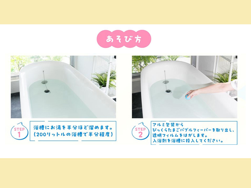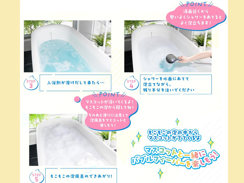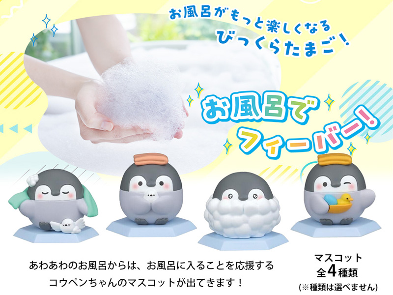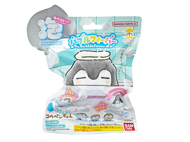 入浴料を湯船に入れて、湯面にシャワーを当てると泡風呂が出来上がる! 「びっくらたまご・バブルフィーバー」からコウペンちゃんが登場!あわあわのお風呂からは、お風呂に入ることを応援するコウペンちゃんのマスコットが出てきます!台座にはコウペンちゃんのメッセージ入り♪メッセージの内容はお風呂に入ってからのお楽しみです。