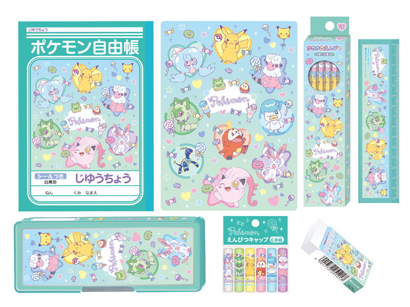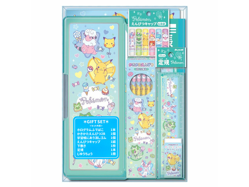 【ポケットモンスター・ファンシータイム】の「文具ギフト」が新登場♪スイート&キュートなデザインの自由帳・下敷・15cm定規・鉛筆キャップ・2Bかきかた鉛筆・消しゴム・筆箱の合計7点がセットになっています!入学準備や新学期準備、お祝いプレゼントにも喜ばれそうなキャラクターグッズです☆