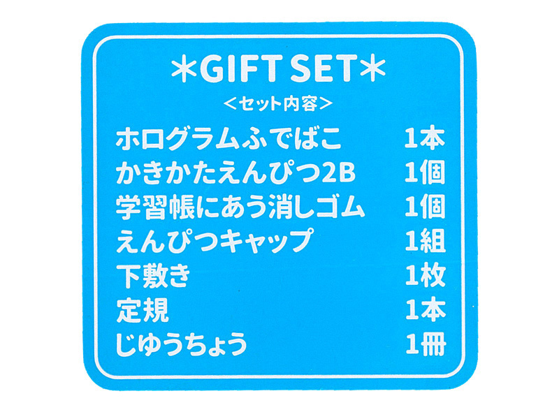 - セット内容:(7点セット)…ホログラムふでばこ×1・かきかた鉛筆2B×1箱(12本)・消しゴム×1・鉛筆キャップ×1P(6入)・下敷き×1・15cm定規×1・自由帳×1