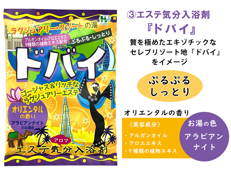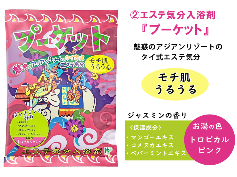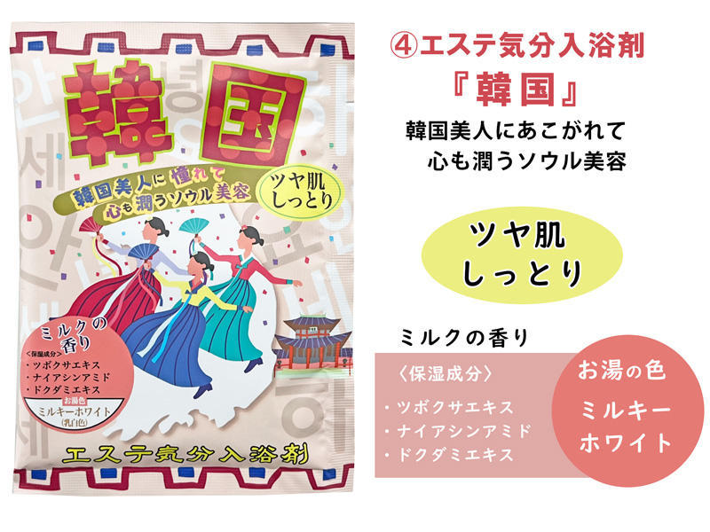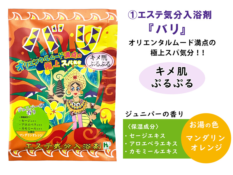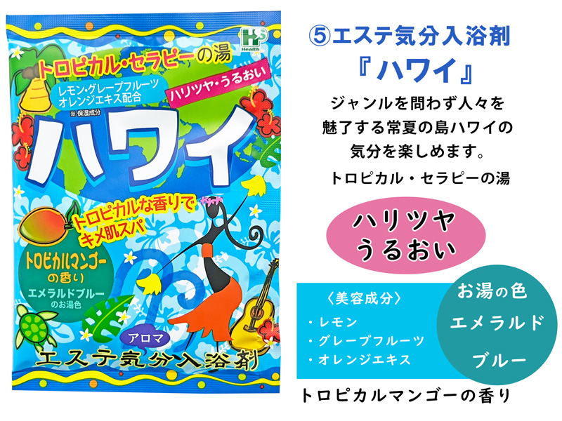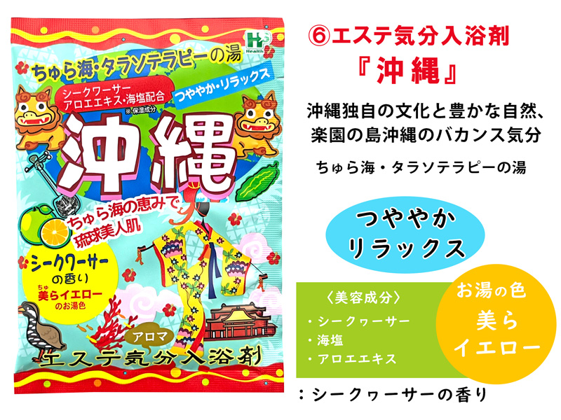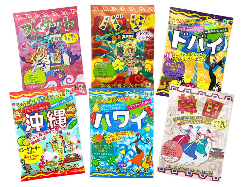 - 『1』バリ…お湯の色(マンダリンオレンジ/ジュニパーの香り)/『2』プーケット…お湯の色(トロピカルピンク/ジャスミンの香り)/『3』ドバイ…お湯の色(アラビアンナイト/オリエンタルの香り)/『4』韓国…お湯の色(ミルキーホワイト/ミルクの香り)/『5』ハアイ…お湯の色(エメラルドブルー/トロピカルマンゴーの香り)/『5』ハアイ…お湯の色(エメラルドブルー/トロピカルマンゴーの香り)/『6』沖縄…お湯の色(美らイエロー/シークワーサーの香り)