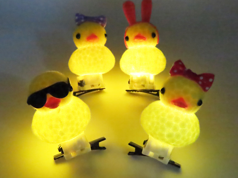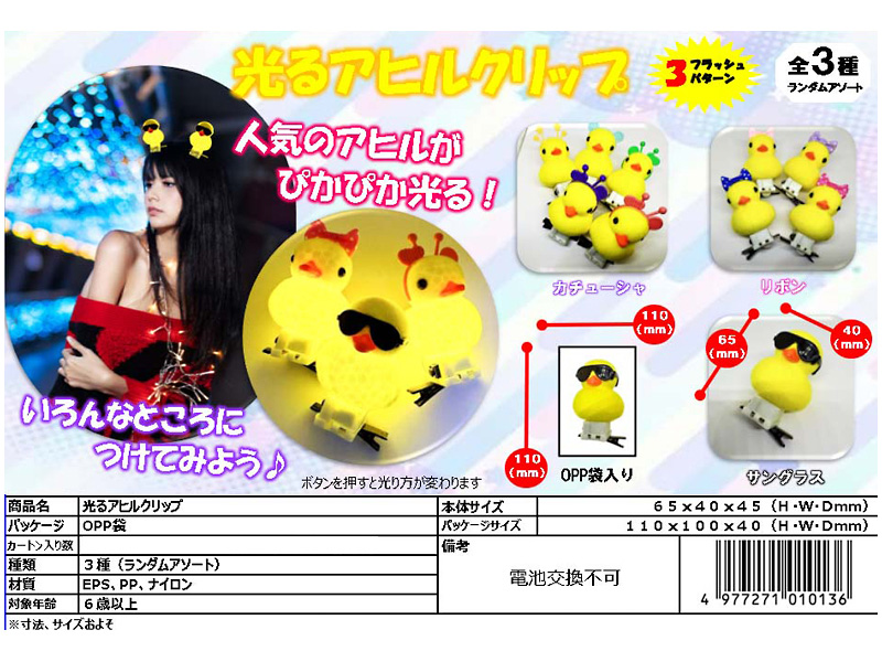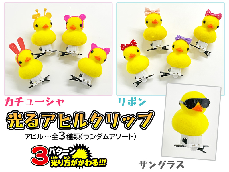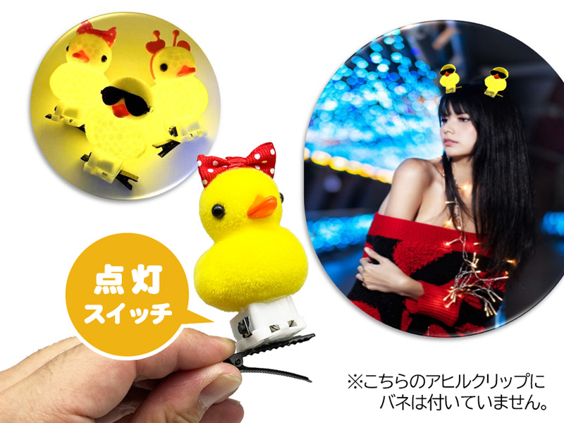 人気のアヒルクリップからピカピカ光るタイプが登場☆彡 クリップで簡単に装着可能!髪飾りやカバン、洋服の等々…どこにつけても可愛いよ♪ボタンを押すと光り方が変わる3パターンのフラッシュ機能付きで、イベントやパーティーを一層盛り上げます。