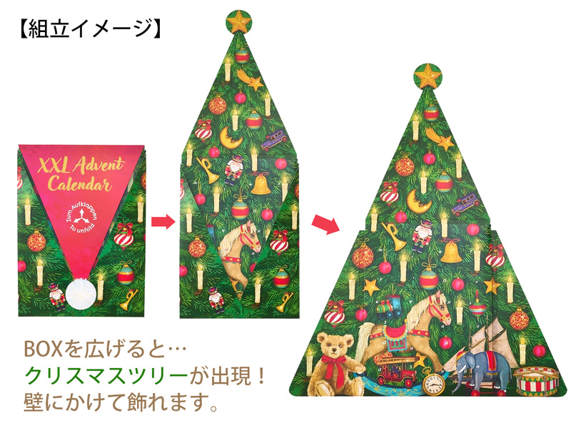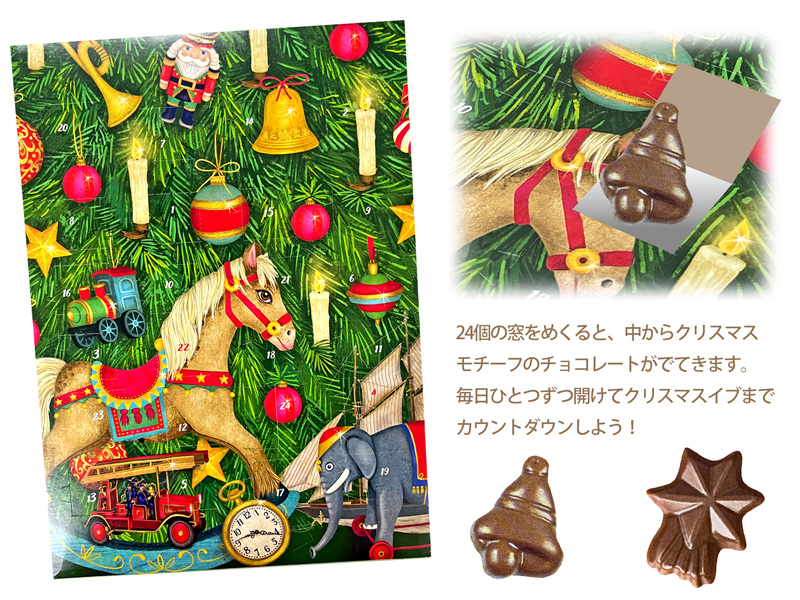 壁にかけて飾れる、クリスマスツリー型のカウントダウンカレンダーが登場。箱に折り畳まれた部分を広げると大きなクリスマスツリーが出現!24個の窓をめくると、中からクリスマスモチーフのチョコレートがでてきます。毎日ひとつずつ開けてクリスマスイブまでカウントダウンしよう!