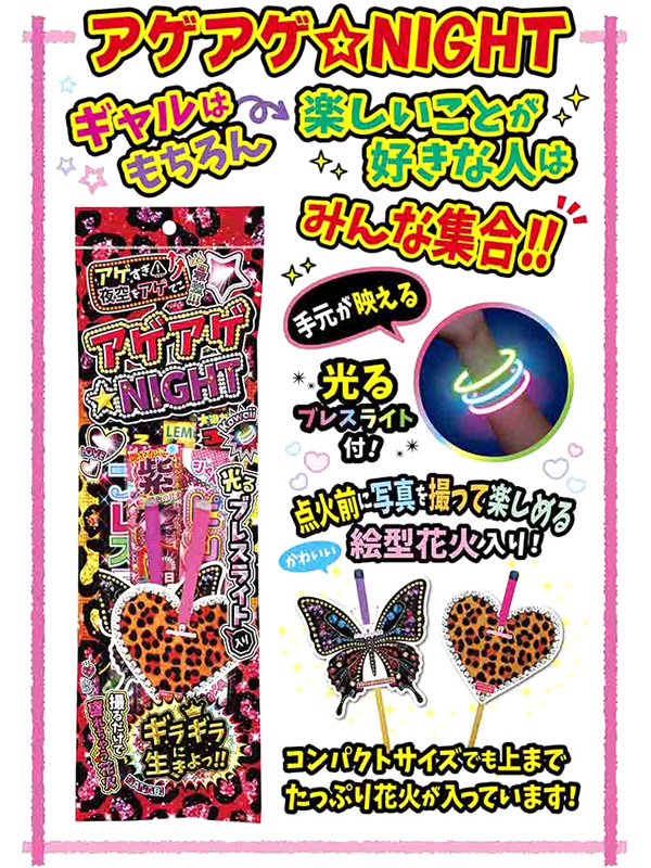 アゲ過ぎ注意!夜空をアゲてこ~「アゲアゲ☆NIGHT」で最高の夏にしちゃお?「アゲアゲ☆NIGHT」はそこらへんのフツーの花火とはワケが違う、最強に映えるラインナップがぎっしり詰まったセット!夜のテンションをさらにブチ上げる光るブレスレットが入ってるから、手元までしっかり盛れるのが神!ギャルの魂ヒョウ柄のハートと、存在感バツグンのデカめ蝶々が花火になっちゃった!火をつける前からもう可愛いし、手に持ってポーズ決めるだけで、マジで令和の最先端ギャルショットの完成でぇ~す!
