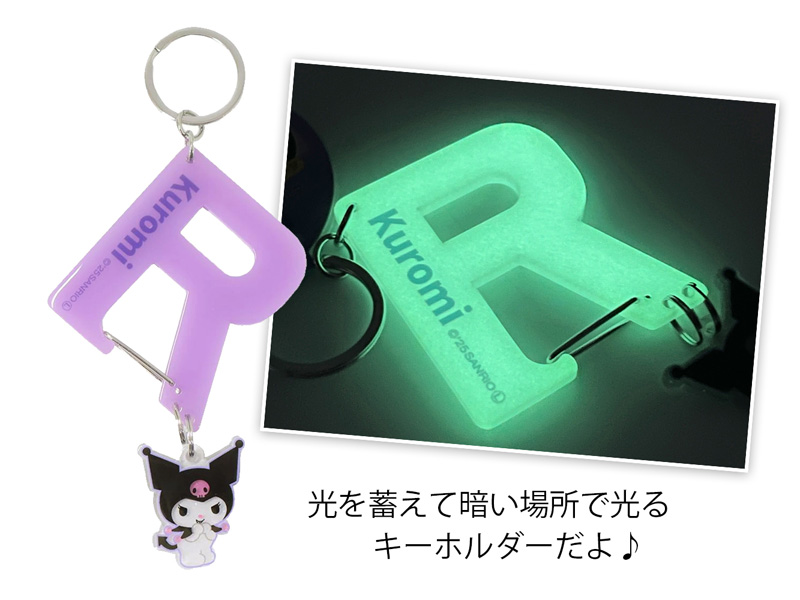 大人気サンリオグッズから可愛いnewアイテムが続々登場~♪こちらはかわいいキャラクターのアクリルマスコットが付いた[蓄光カラビナキーホルダー] アルファベットの文字部分はカラビナになっており、光を蓄え暗い場所でぼんやりと光ります。バッグやリュックからぶら下げてもキュート♪個人用にはモチロンのこと、可愛い見た目はプレゼントにもぴったりです!