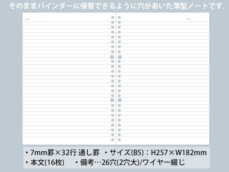- ノートの仕様…・7mm罫×32行 通し罫/・本文:(16枚)/ワイヤー綴じ/リング:26穴(2穴大)