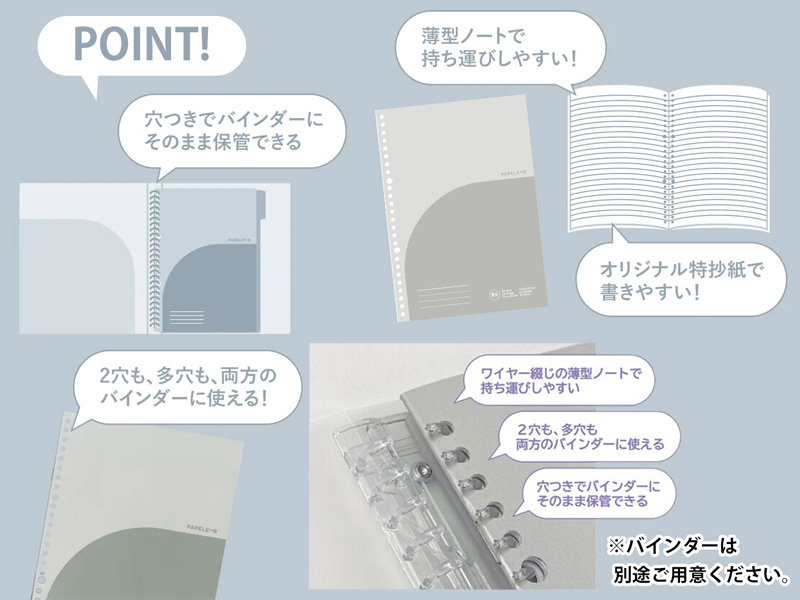 シンプルなデザインで幅広く使えるPAPELEUR(パペルール)の文具シリーズから 便利なアイテムが続々登場!こちらはそのままバインダーに保管できるように穴があいた薄型B5ノート。ノートの背に穴が開いておりそのままバインダーへ保管することが可能…(2穴も多穴も両方のバインダーに使えます)ワイヤー綴じの薄型ノートなのでファイリングも持ち運びしやすいのも特徴です。