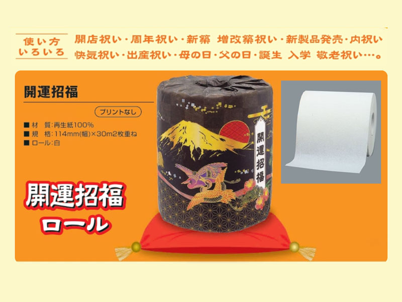 高級感あるトイレットペーパー【開運招福ロール】が登場!包装紙は自然界の縁起物「富士山・鶴・亀・松竹梅・菊」や水引、麻の葉の柄など、縁起のいいものを組み合わせた、超おめでたいデザイン。年末年始、お正月、お年賀、合格祈願、おめでたいイベントに・・販促品や景品におすすめです。
